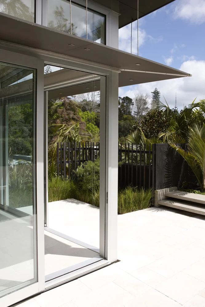 A modern house and landscape located within the heart of one of Auckland's oldest suburbs. This project was a new design and construction build. Crescent house optimises open plan living flowing out of the house into the natural landscape. Large patio and lawn areas are bordered by screens and planting schemes designed to frame the landscape whilst offering amazing vistas to Auckland CBD and harbour.