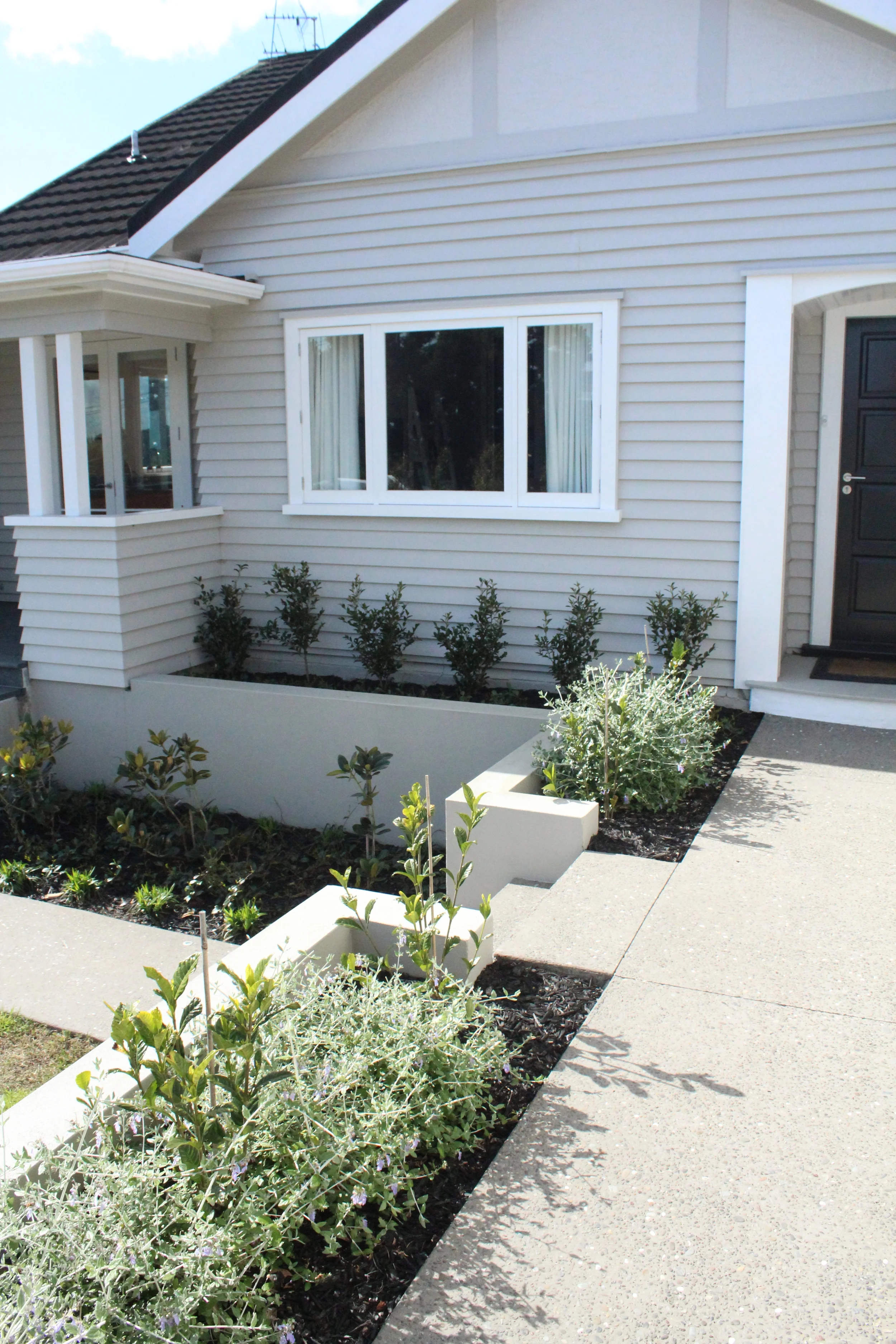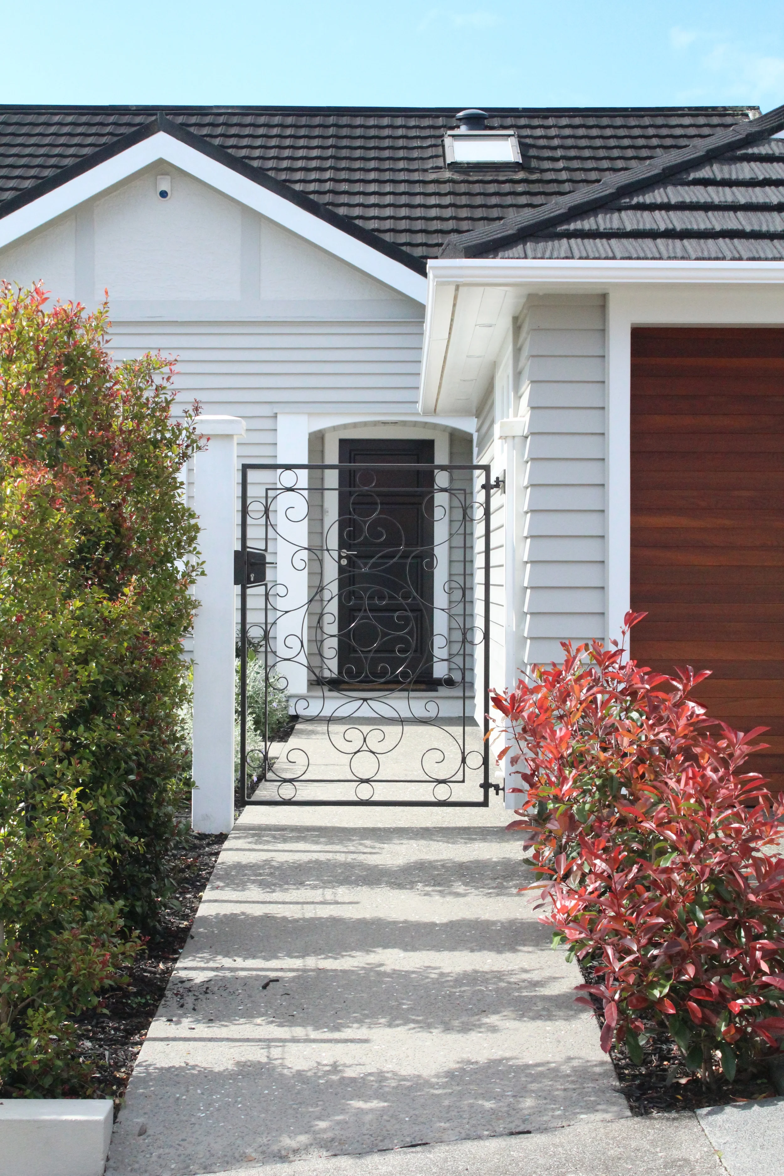 This design focused on creating a stylish entry for a traditional bungalow, including a lawn space and a serviceable vegetable garden. Hedging species Eugenia and Photinia Red Robin were used for clean lines and privacy screening at the front of the property whilst Teucrium Fruticans and Camellia Sasanqua add a more traditional feel in the concrete plastered planters framing the house. Exposed concrete pathways featuring a decorative stone add warmth and texture and a custom wrought iron entrance gate completes the classic feel to this bungalow style home. Greens and reds were chosen for the planting colour palette to complement the warm tones of the house and cedar slating used throughout.